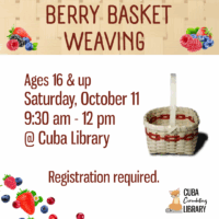 Adults and teens ages 16 & up are invited to sign up to create a quart berry basket at our basket weaving class on Saturday, October 11 from 9:30 a.m. to 12 p.m. at the Cuba Library. Beginner basket weavers …