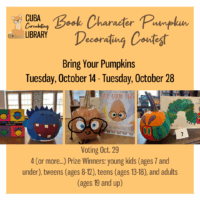 It’s time once again for our pumpkin decorating contest! The Cuba Circulating Library is hosting our 5th Annual Book Character Pumpkin Decorating Contest that begins on Tuesday, October 14, and lasts through Tuesday, October 28. Decorate a pumpkin (or gourd) …