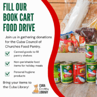 Help us Fill Our Book Cart for a Food Drive! Join us in gathering donations for the Cuba Council of Churches Food Pantry. Bring your donations to the library anytime during the month of November. According to the Cuba Council …