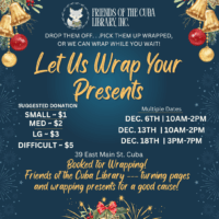 Let the Friends Wrap Your Presents! Drop them off. . . Pick them up wrapped, or we can wrap while you wait! Multiple Days: Dec 6th ~ 10am-2pm, Dec 13th ~ 10am-2pm, Dec 18th ~ 3pm-7pm. SUGGESTED DONATION: Small – …