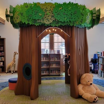 involved moving all of the books and other materials to the community room where a temporary children’s area was set up so that the public would still have limited access to those items. During Phase 1, the lighting was updated throughout the library, with new light fixtures installed in the children’s area, a wall with reading nooks, a play stage, a new video game station in the YA area, and a new water fountain with a bottle filler. Following the completion of Phase 1, the public was invited to an open house during Dairy Days. Phase 2 of the children’s area renovation began in the fall of 2024 with an archway to mirror the one on the adult side of the main floor. In January of 2025, new carpets were installed throughout the main floor, everything received a new coat of paint, and an ADA accessible sculptural tree with seating, a puppet theater, and interactive activities was installed. In addition, the seating in the adult section was updated with more modern chairs at the tables, more comfortable & cozy furniture by the fireplace, and a smaller study carrel that allows for more ease of movement around the stacks. We also purchased a larger fish tank thanks to donations from local aquarium enthusiasts, a hit with many of the children who visit the library.