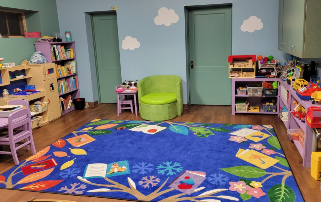 The story area in the children’s room includes a large area rug for the children to sit on while the youth coordinator sits in a comfy chair with a leaf motif.
