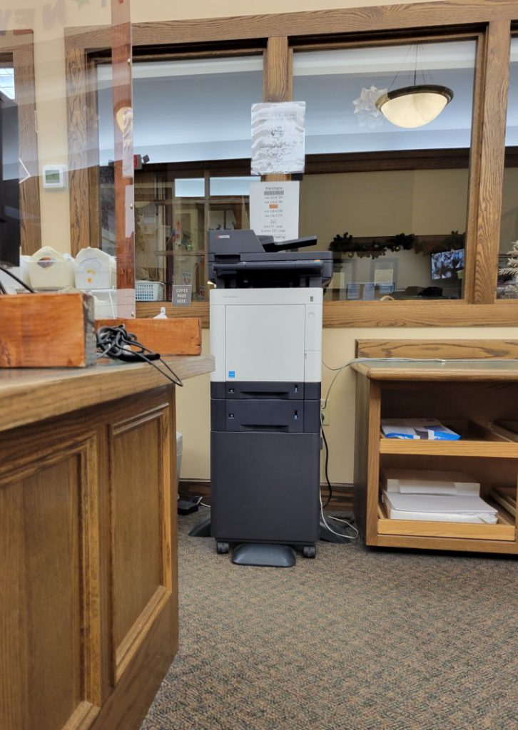 The copy machine is on the right side of the circulation desk. Our machine can make black and white or color copies, send faxes, or scan documents to email or a USB.