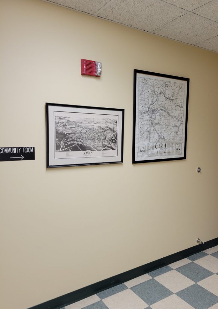 Two framed historical maps of Cuba, NY are on display on the wall in the hallway outside the community room, which is located to the right as you enter the basement level of the library.